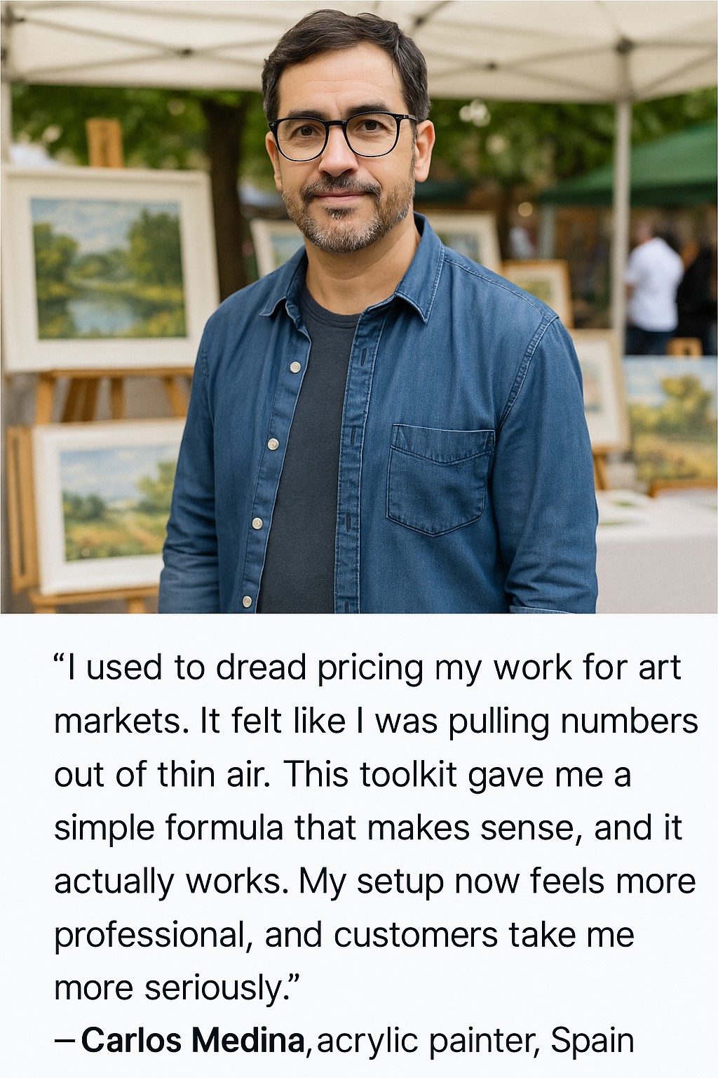 The Artist’s Pricing Toolkit gives you the essential tools, formulas, and mindset shifts to confidently price your artwork — whether you're selling online, in galleries, or at shows.