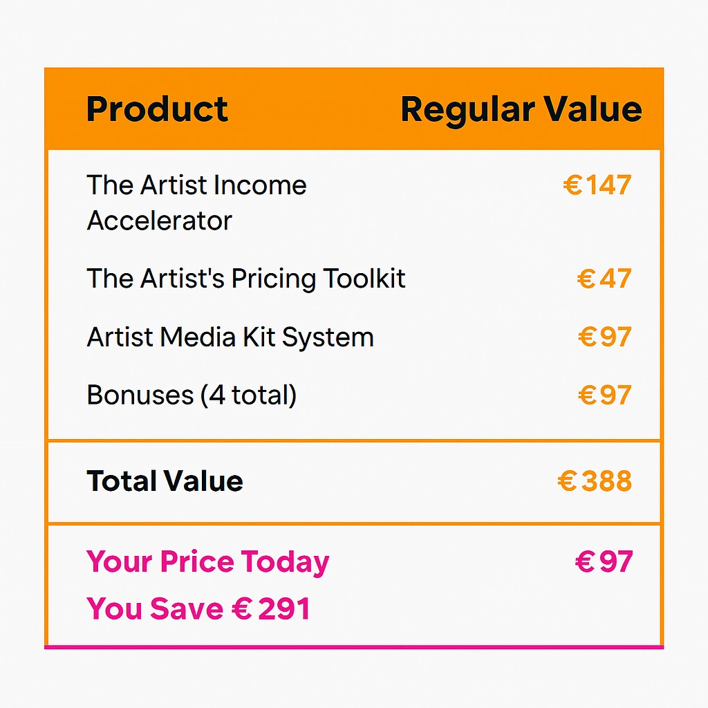 This fast-action toolkit helps you design, price, and sell your first €1,000 art offer — so you can prove to yourself it’s possible.